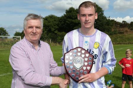 DJL-Secretary-Jimmy-Haughey-pictured-presenting-the-Gweedore-Area-Shield-to-Chris-Duffy-captain-of-Cranford-United
