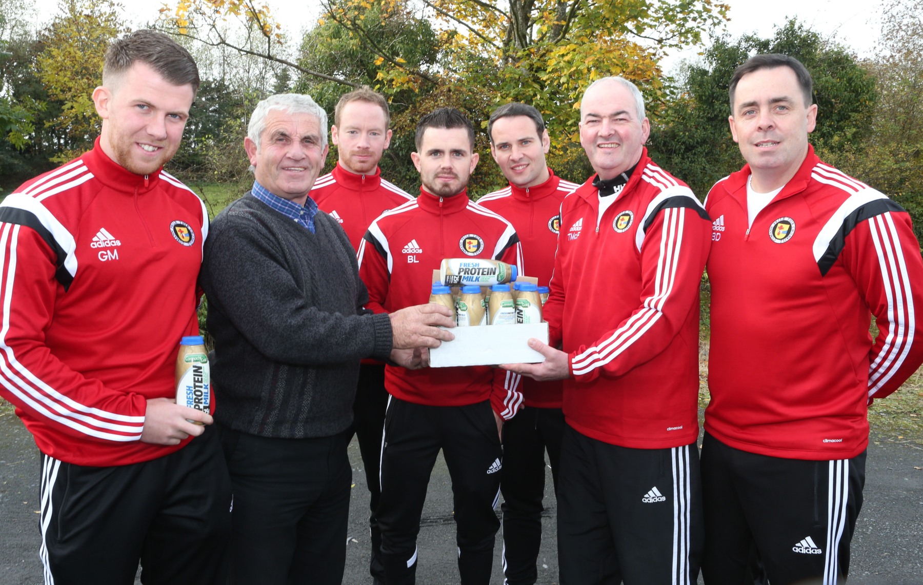 Tommy Mc Fadden, Donegal Creameries/Arivo representative pictured presenting Donegal League Chairman John Joe Mc cafferty with High Protein drinks for the Oscar traynor Panel. Included are team Captain Barney Lafferty, Manager Brian Dorrian and Panel members Gary Merritt, Christopher Sweeney and Chris Malseed. Pic.: Gary Foy, League PRO