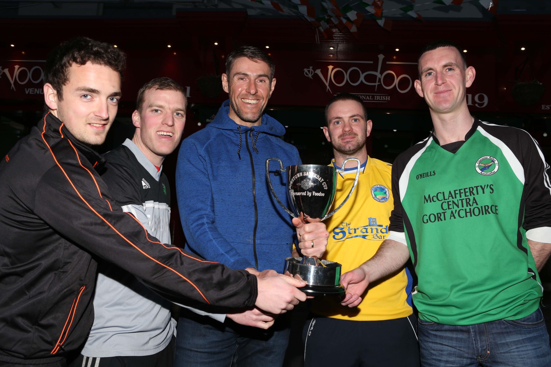 And Then There Were Four!!! Jason Black, Proprietor of The Voodoo Venue, Letterkenny pictured with the captains of the four teams who will take part in the Voodoo Venue Cup semi-finals on Saturday afternoon at Diamond Park, Ballyare. Included left to right are Martin Proctor, Arranmore United, Garvan Grieve, Glencar Celtic, Brendan Brennan, Strand Rovers and Paudgie Mc Ghee Glenea United Reserves. Pic.: Gary Foy, newsandsportfiles
