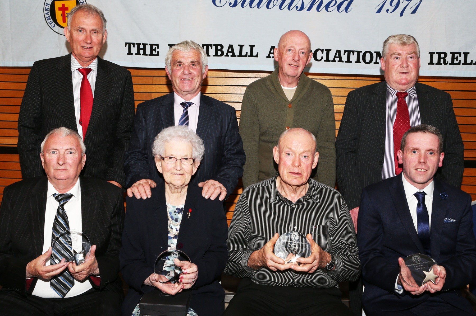 Lifetime Achievement Award recipients Hugh Rodgers, Mary Mc Ateer, Pat Mc Ginty and Liam Porter pictured with Donegal Junior league Executive members Gerry Rodgers, John Joe Mc Cafferty, Declan Sherlock and Liam Porter.